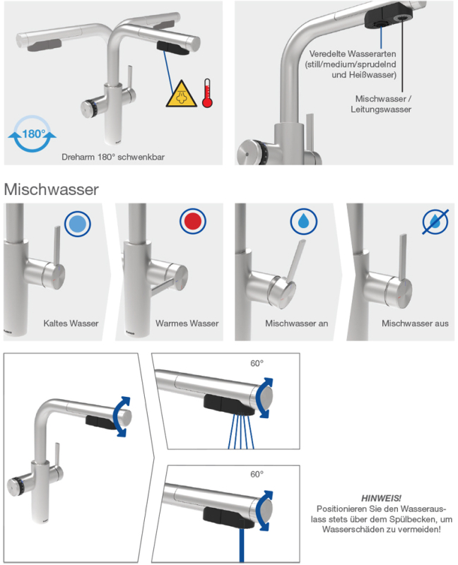 - 180° schwenkbarer Auslauf für Mischwasser und veredeltes Wasser