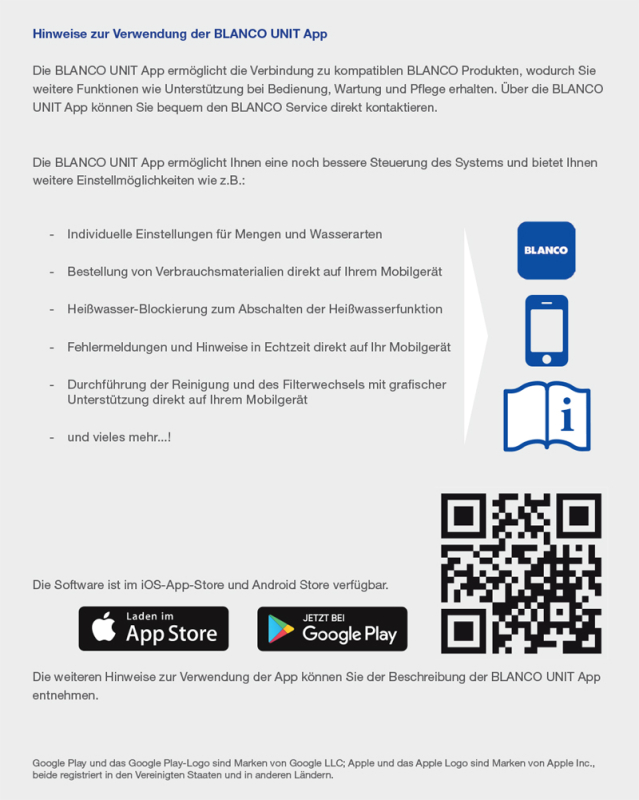 - Ersatzfilter und Kartuschen, sowie sonstiges Verbrauchsmaterial kann ausschließlich direkt über den Blanco Online Shop bezogen werden
