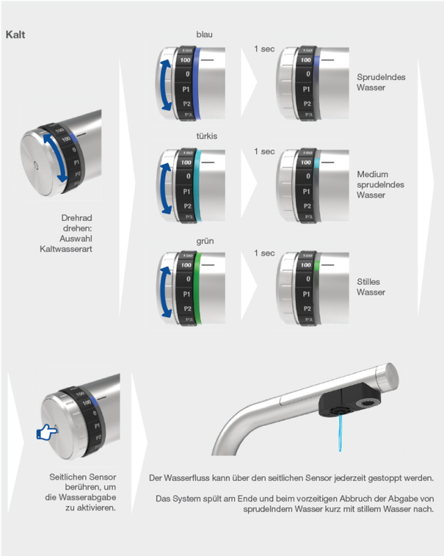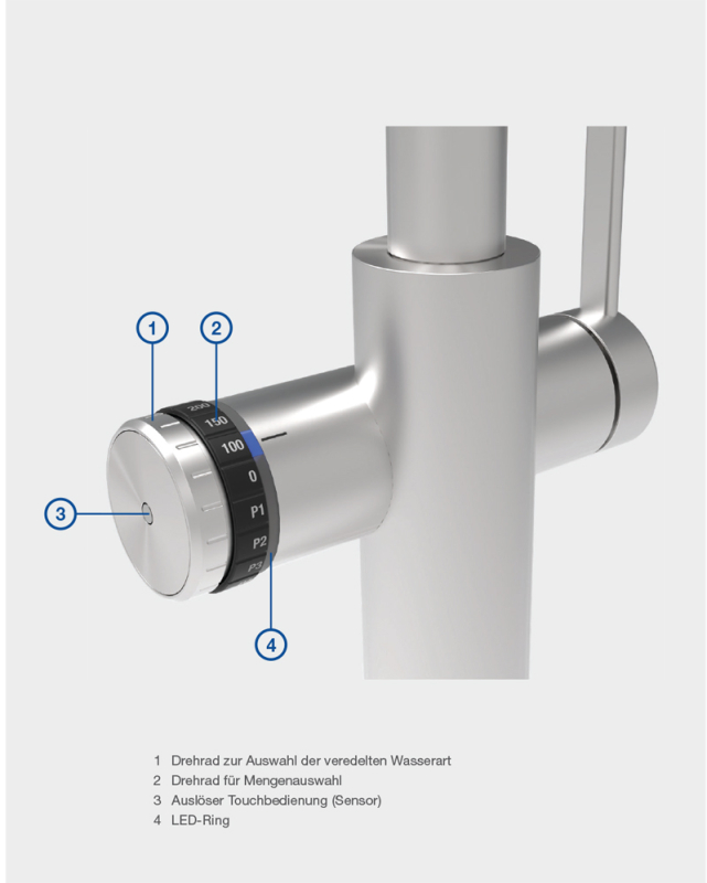 - Click and Touch: Auswahl vordefinierter Wasserarten und Volumen in ml dank Skalierungsrad und