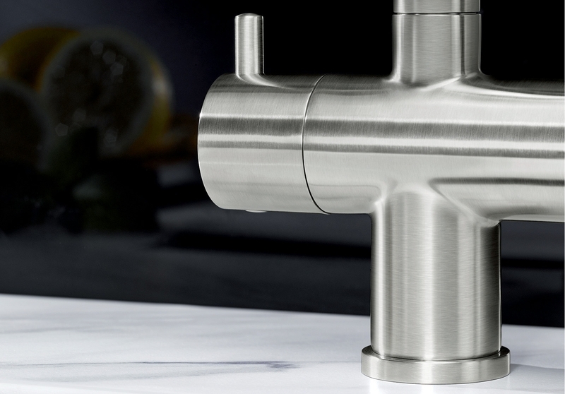 - Komfortable 3-in-1-Armatur mit Mischhebel rechts für Kalt- und Warmwasser sowie Drehgriff links für gefiltertes Wasser