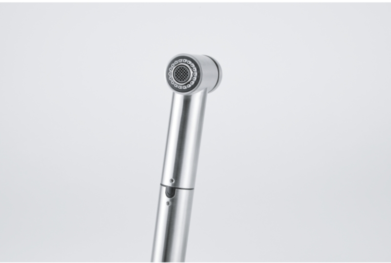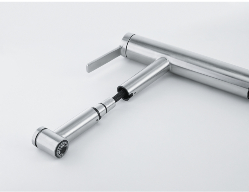- Massiv-Edelstahl Armatur mit geradlinigem Design und Auszugsbrause in hochwertiger Metallausführung