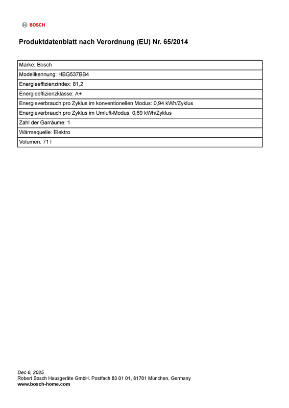 Energieverbrauch pro Zyklus im Umluft-Modus: 0.69 kWh