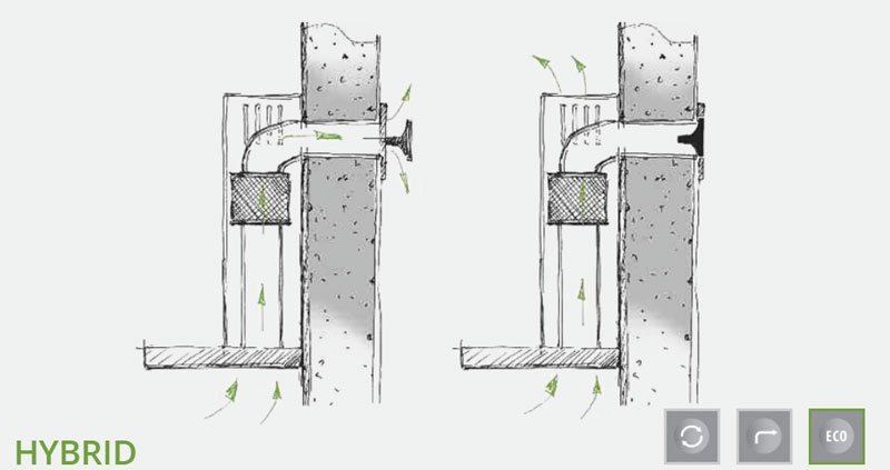 Die besondere berbel-EcoSwitch Technik ermöglicht jederzeit die flexible Wahl zwischen Um- und Abluftbetrieb einer berbel Dunstabzugshaube: Im Abluftbetrieb wird die Luft durch den automatisch öffnenden Mauerkasten nach draußen geführt. Im Umluftbetrieb bleibt der Mauerkasten geschlossen und die Luft wird per Umluft gereinigt. Ermöglicht wird dies durch ein intelligentes Gesamtsystem aus berbel Haube mit Aktivkohlefilter als Hybridversion sowie aktivem berbel Mauerkasten. Somit lässt sich flexibel je nach Koch- oder Wettersituation durch Berühren des Sensor-Touch-Bedienfeldes in den passenden Modus schalten.