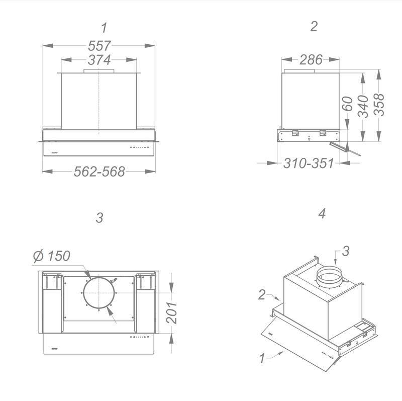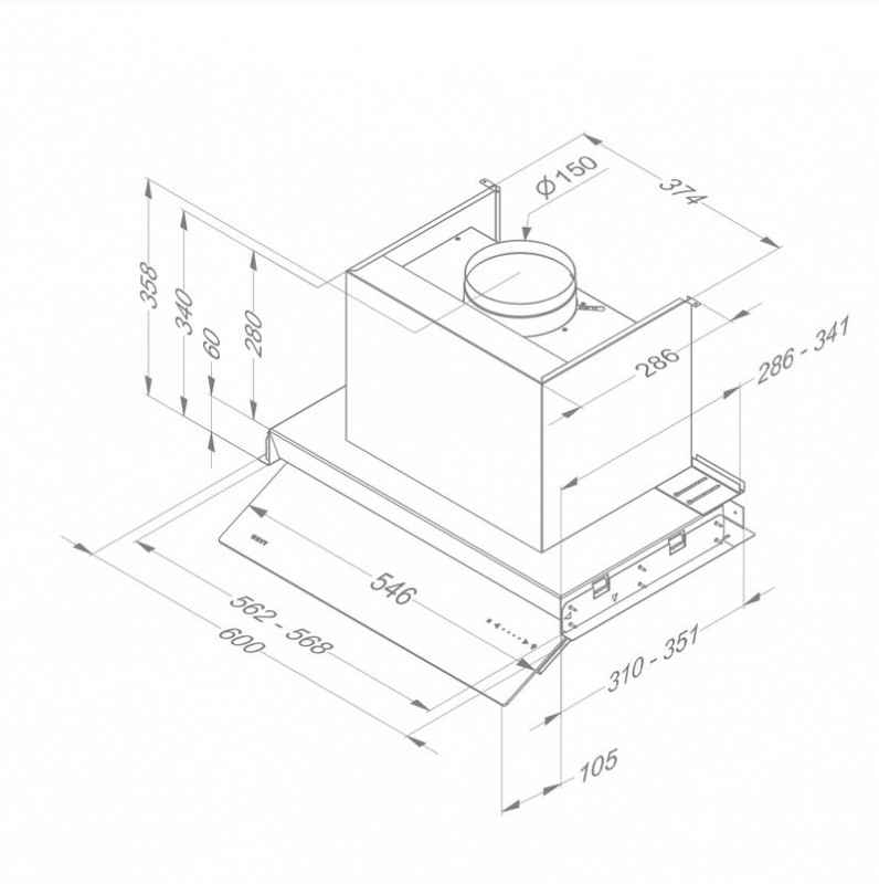 - Kann unsichtbar in einen Oberschrank mit minimaler und maximaler Tiefe von 310 bis 351 mm integriert werden