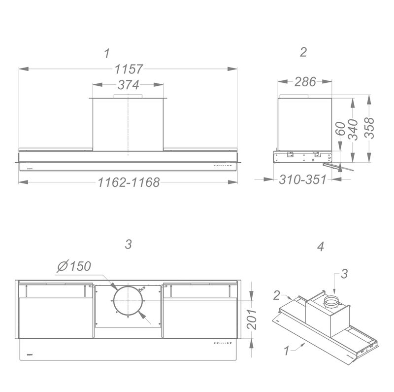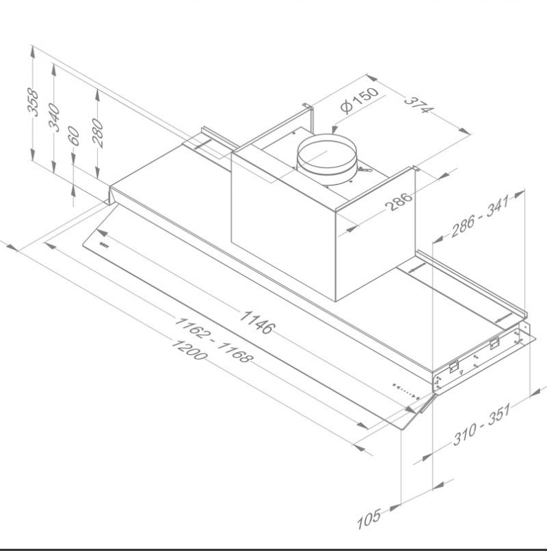 - Kann unsichtbar in einen Oberschrank mit minimaler und maximaler Tiefe von 310 bis 351 mm integriert werden