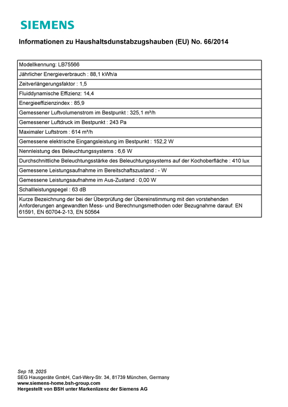- Leistungsstufe 3: Lüfterleistung 468 m3/h; Geräuschwert 63 dB (A) re1pW