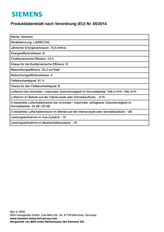Leistungsstufe 3: Lüfterleistung 583 m3/h; Geräuschwert 65 dB (A) re1pW