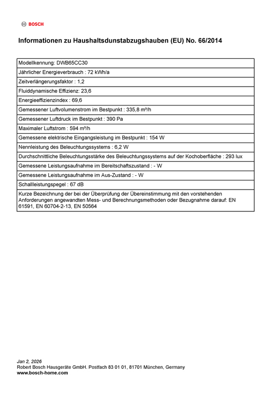 - Leistungsstufe 3: Lüfterleistung 594 m3/h; Geräuschwert 67 dB (A) re1pW