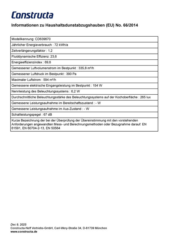 - Leistungsstufe 3: Lüfterleistung 594 m3/h; Geräuschwert 67 dB (A) re1pW
