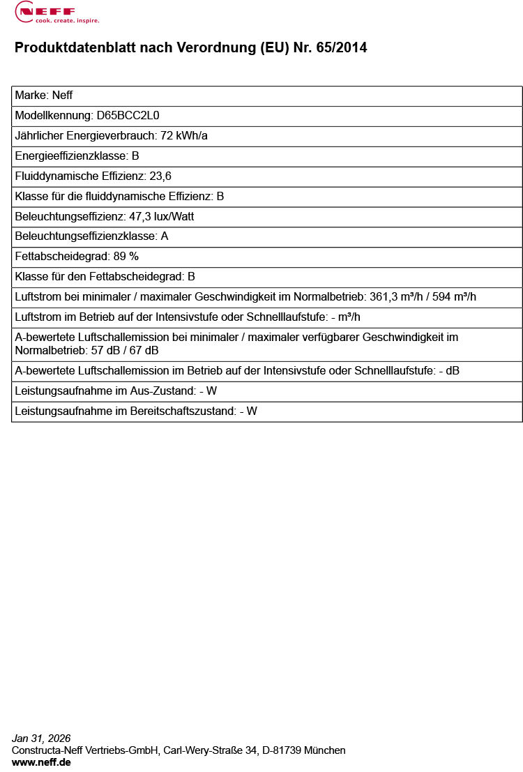 - Leistungsstufe 3: Lüfterleistung 569 m3/h; Geräuschwert 71 dB (A) re1pW