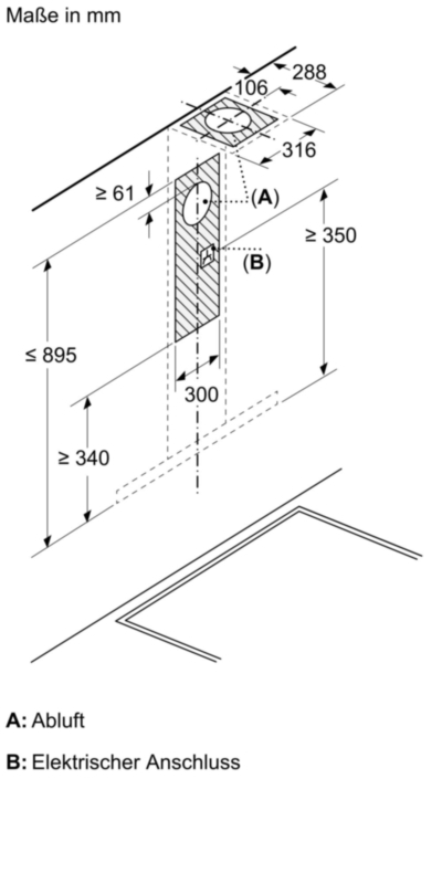 - Gerätemaße Abluft (HxBxT): 635-895 x 598 x 500 mm