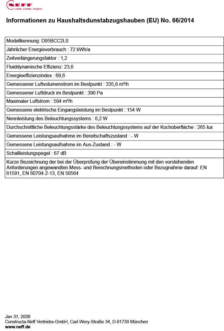 - Leistungsstufe 3: Lüfterleistung 594 m3/h; Geräuschwert 67 dB (A) re1pW