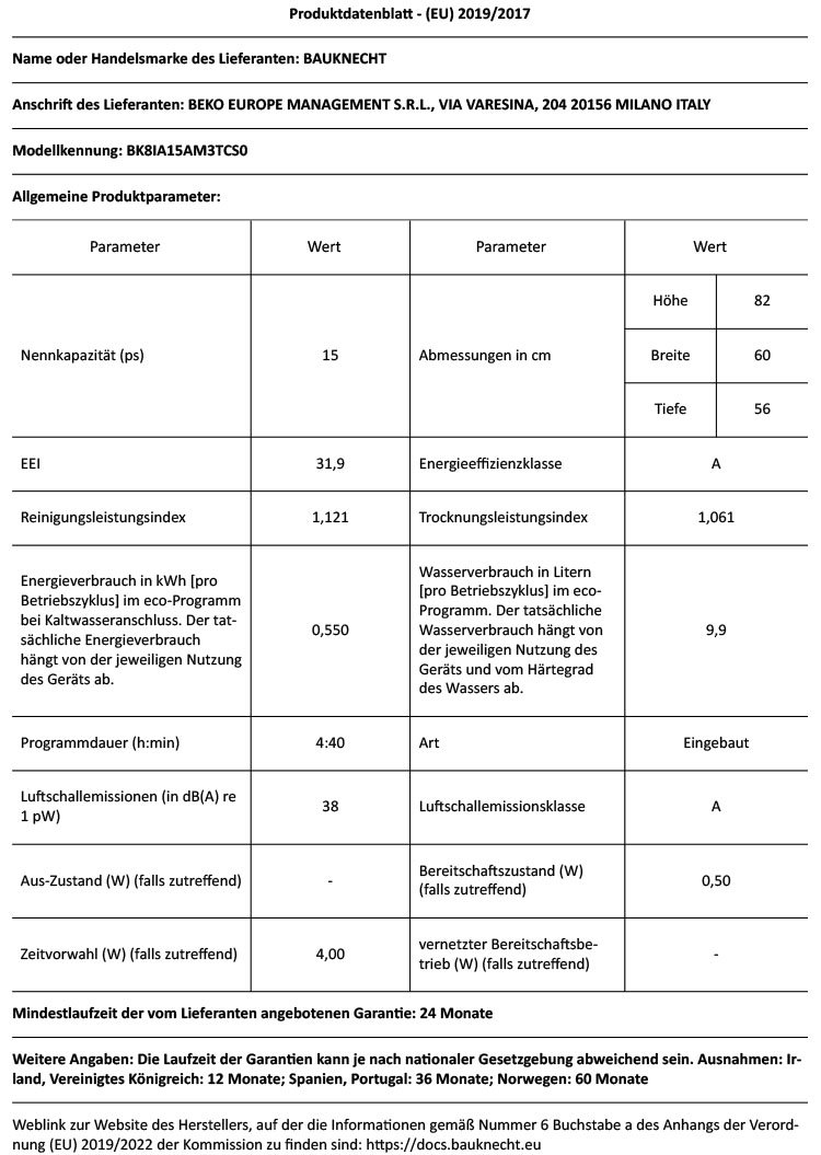 - Energieverbrauch des eco-Programms pro 100 Betriebszyklen: 55 kWh Strom, 9,9 Liter Wasser, 0,55 kWh Strom im eco-Programm pro Betriebszyklus