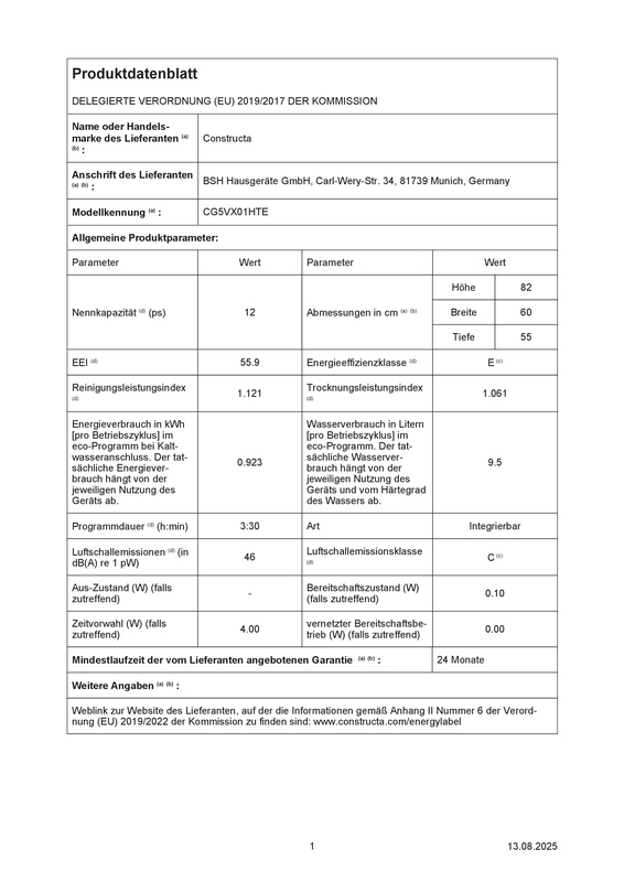 Luftschallemissionen (EU 2017/1369): 46 dB(A) re 1pW