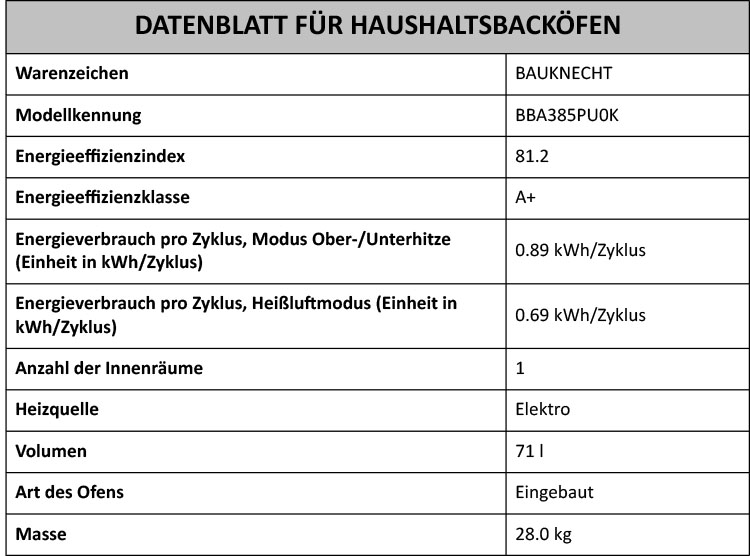 - Energieverbrauch nach DIN 0.69 kWh Umluft