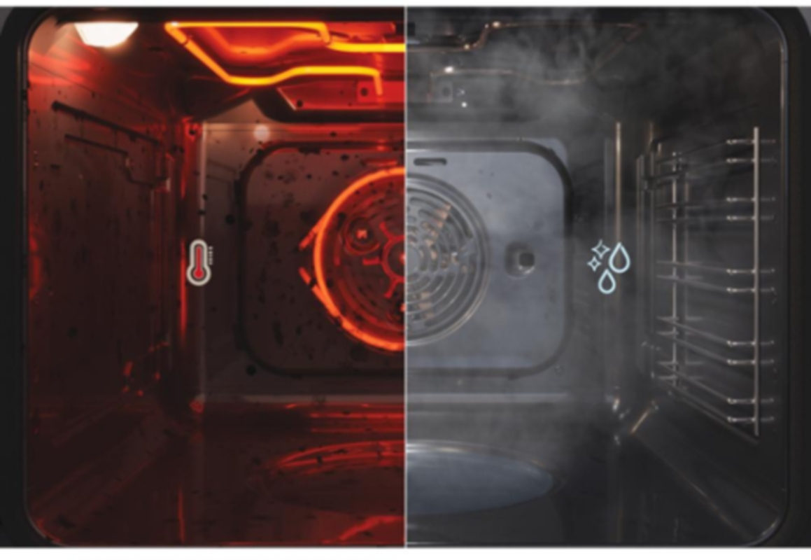Bei leichter Verschmutzung. Ca. 400 ml Wasser und etwas Spülmittel in den Garraum stellen und Reinigungsprogramm auswählen. Das umweltfreundliche Reinigungssystem weicht eingebrannte Rückstände auf, sodass sie sich anschließend erheblich leichter abwischen lassen