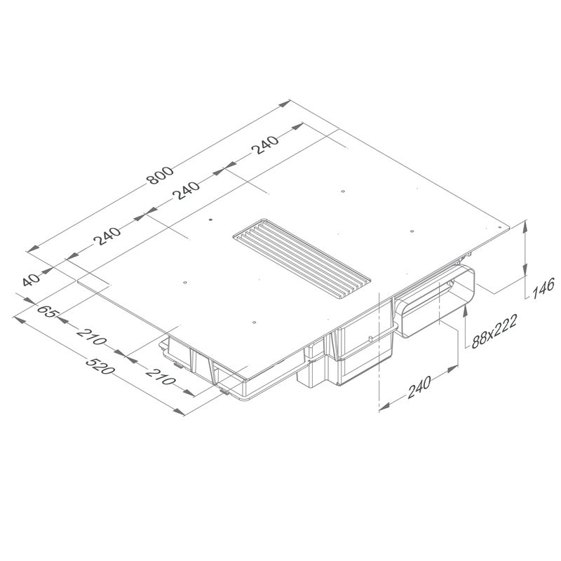 - Kochzone 3 Rechts zentral, Abmessungen (mm) / Power(Boost) W 240×210 / 2100 (3000)