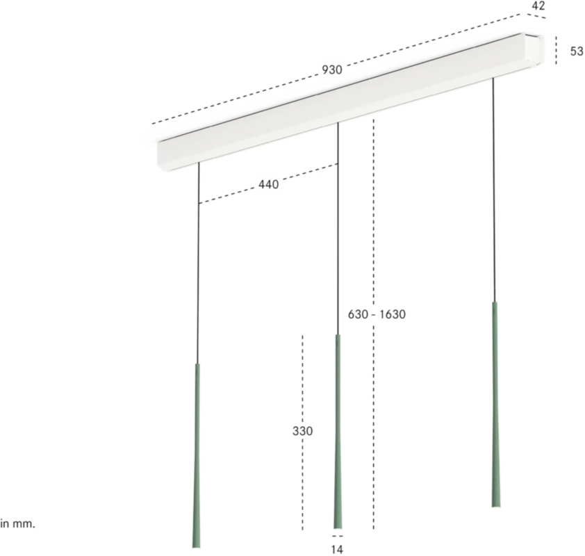 - Abmessungen Deckengehäuse (B x T x H) 930 x 42 x 53 mm