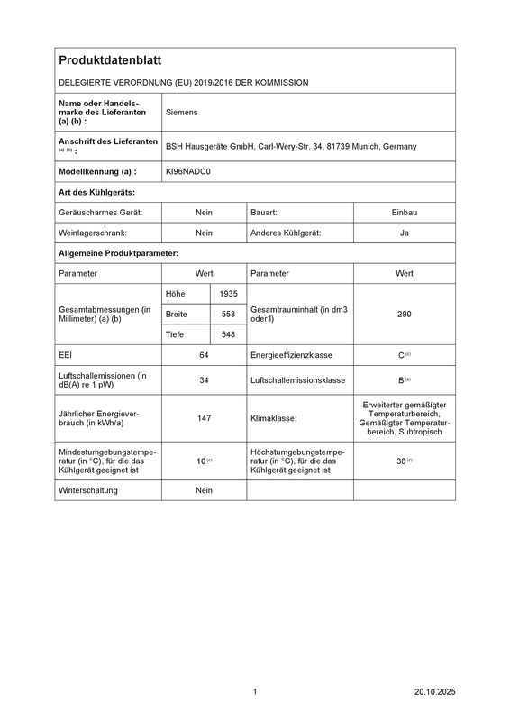 - Durchschnittlicher Energieverbrauch in Kilowattstunden pro Jahr (kWh/a) (EU 2017/1369): 147 kWh/annum