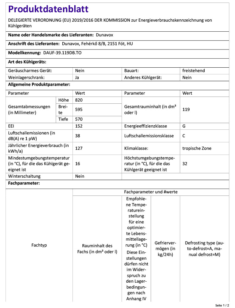 - Klimaklassen: SN: +10 °C bis +32 °C, N: +16 °C bis +32 °C, ST: +16 °C bis +38 °C, T: +16 °C bis +43 °C