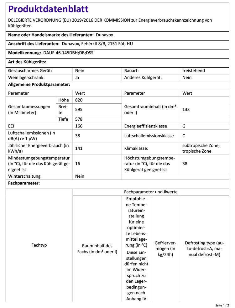 - Jahresverbrauch gilt bei Voraussetzung einer Umgebungstemperatur von 25°C und einer Betriebstemperatur von ≥4°C.