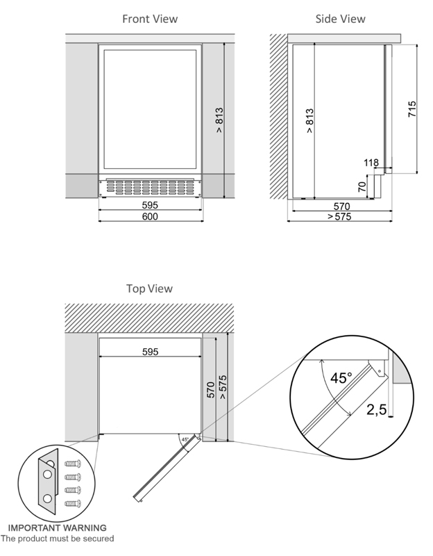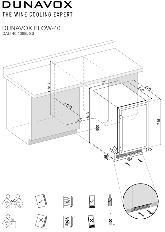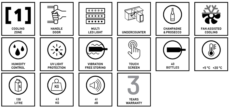 Äußeren, sowie einem Türgriff aus Edelstahl. Dieses Modell ist perfekt für zeitgenössische Küchenumgebungen geeignet. Die Flaschen lagern auf massiven Buchenholzregalen und sind umgeben von einer LED-Innenbeleuchtung. Bitte beachten Sie, dass dieses Modell für den Unterbau und freistehend geeignet ist.