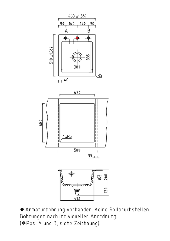 - Der Auslieferungszustand der Spüle beinhaltet eine Lochbohrung für die Armatur. Es sind keine Sollbruchstellen vorhanden; eine oder weitere Durchbohrung(en) kann nur im Werk des Herstellers Systemceram vorgenommen werden. Bitte geben Sie uns dafür exakt die von Ihnen gewünschte Position auf der Spüle an, gern auch anhand einer separaten Email, oder nehmen Sie diesbezüglich mit uns Kontakt auf. Bitte beachten Sie auch, daß Sie durch diese persönliche Positionierung der Lochbohrung einen für Sie individualisierten Artikel bestellen und erwerben, der nur für Sie speziell angefertigt wird. Diese Individualisierung und die damit verbundene nicht gegebene Möglichkeit eines anderweitigen Verkaufes durch uns kann zu einem Nicht-Wirksamwerden des Widerrufrechtes führen, welches individualisierte Produkte ausdrücklich ausnimmt. (Auf eine mit Produktmängeln zusammenhängende Reklamation hat dies selbstverständlich keinen Einfluß). Bitte sprechen Sie uns ggfs. hierauf an.