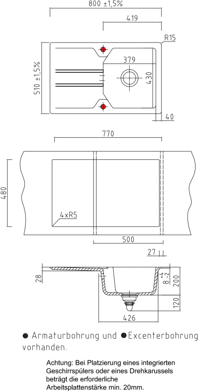 - diese Spüle ist nur als Einbau- bzw. Auflage-Spüle einbaubar; ein flächenbündiger Einbau oder der Einsatz als Unterbau-Spüle ist nicht möglich!