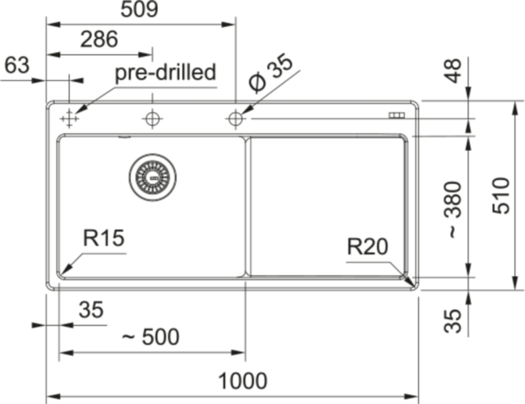 - mit 2 x Armaturenbohrungen, 1 Vorbohrung