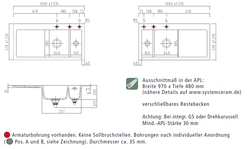 - Der Auslieferungszustand der Spüle beinhaltet eine Lochbohrung für die Armatur. Es sind keine Sollbruchstellen vorhanden; eine oder weitere Durchbohrung(en) kann nur im Werk des Herstellers Systemceram vorgenommen werden. Bitte geben Sie uns dafür exakt die von Ihnen gewünschte Position auf der Spüle an, gern auch anhand einer separaten Email, oder nehmen Sie diesbezüglich mit uns Kontakt auf. Bitte beachten Sie auch, daß Sie durch diese persönliche Positionierung der Lochbohrung einen für Sie individualisierten Artikel bestellen und erwerben, der nur für Sie speziell angefertigt wird. Diese Individualisierung und die damit verbundene nicht gegebene Möglichkeit eines anderweitigen Verkaufes durch uns kann zu einem Nicht-Wirksamwerden des Widerrufrechtes führen, welches individualisierte Produkte ausdrücklich ausnimmt. (Auf eine mit Produktmängeln zusammenhängende Reklamation hat dies selbstverständlich keinen Einfluß). Bitte sprechen Sie uns ggfs. hierauf an.