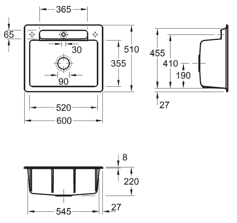 Option "serienmäßige Vorbohrung": Der Auslieferungszustand der Spüle ist inklusive vorgestanzter Lochbohrungen (serienmäßige Vorbohrung); die Oberseite der Spüle ist dabei verschlossen und muß vor Ort an den gekennzeichneten Stellen durchstoßen werden.