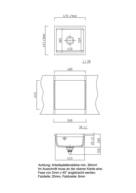 - Option "Randstärkenreduzierung auf 10 mm": Für Spülen mit flächenbündigem Einbau in Arbeitsplatten mit weniger als 25mm Stärke, bitte vorab mit Arbeitsplattenhersteller klären ob benötigt.