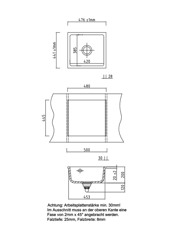 - Option "Randstärkenreduzierung auf 10 mm": Für Spülen mit flächenbündigem Einbau in Arbeitsplatten mit weniger als 25mm Stärke, bitte vorab mit Arbeitsplattenhersteller klären ob benötigt.