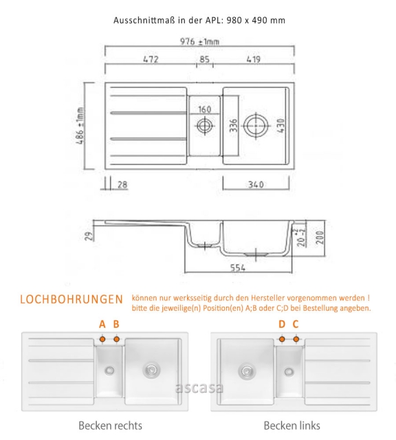 Bitte geben Sie uns dafür die von Ihnen gewünschte(n) Position(en) für eine oder mehrere Lochbohrungen auf der Spüle an oder nehmen Sie diesbezüglich mit uns Kontakt auf. Bitte beachten Sie auch, daß Sie durch diese persönliche Positionierung der Lochbohrung einen für Sie individualisierten Artikel bestellen und erwerben, der nur für Sie speziell angefertigt wird. Diese Individualisierung und die damit verbundene nicht gegebene Möglichkeit eines anderweitigen Verkaufes durch uns kann zu einem Nicht-Wirksamwerden des Widerrufrechtes führen, welches individualisierte Produkte ausdrücklich ausnimmt. (Auf eine mit Produktmängeln zusammenhängende Reklamation hat dies selbstverständlich keinen Einfluß). Bitte sprechen Sie uns ggfs. hierauf an. - Ausschnittmaß in der Arbeitsplatte: 980 X 490 mm