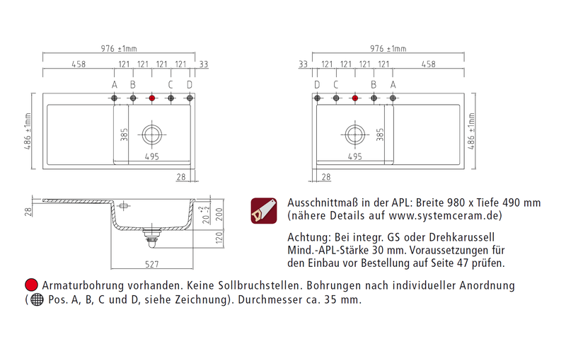 - Der Auslieferungszustand der Spüle beinhaltet eine Lochbohrung für die Armatur. Es sind keine Sollbruchstellen vorhanden; eine oder weitere Durchbohrung(en) kann nur im Werk des Herstellers Systemceram vorgenommen werden. Bitte geben Sie uns dafür exakt die von Ihnen gewünschte Position auf der Spüle an, gern auch anhand einer separaten Email, oder nehmen Sie diesbezüglich mit uns Kontakt auf. Bitte beachten Sie auch, daß Sie durch diese persönliche Positionierung der Lochbohrung einen für Sie individualisierten Artikel bestellen und erwerben, der nur für Sie speziell angefertigt wird. Diese Individualisierung und die damit verbundene nicht gegebene Möglichkeit eines anderweitigen Verkaufes durch uns kann zu einem Nicht-Wirksamwerden des Widerrufrechtes führen, welches individualisierte Produkte ausdrücklich ausnimmt. (Auf eine mit Produktmängeln zusammenhängende Reklamation hat dies selbstverständlich keinen Einfluß). Bitte sprechen Sie uns ggfs. hierauf an.
