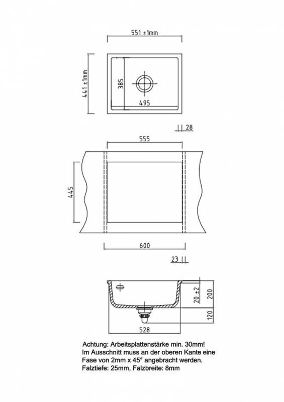 - Option "Randstärkenreduzierung auf 10 mm": Für Spülen mit flächenbündigem Einbau in Arbeitsplatten mit weniger als 25mm Stärke, bitte vorab mit Arbeitsplattenhersteller klären ob benötigt.