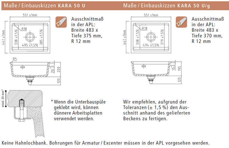 - Ausschnittsmaß in der Arbeitsplatte: 483 x 375 mm / R 12 mm
