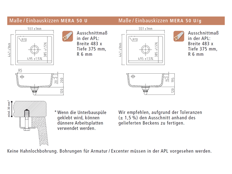 - Ausschnittsmaß in der Arbeitsplatte: 483 x 375 mm / R 6 mm