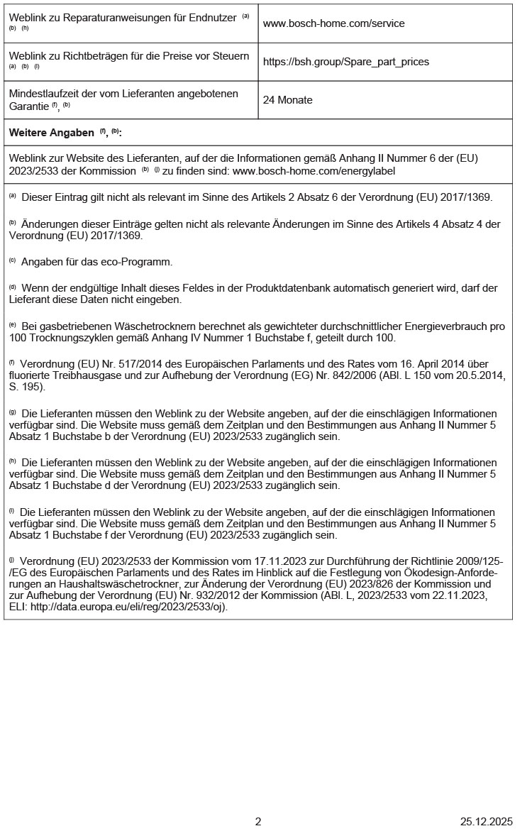 ² Gewichteter durchschnittlicher Energieverbrauch für 100 Trocknungszyklen in kWh im Eco Programm