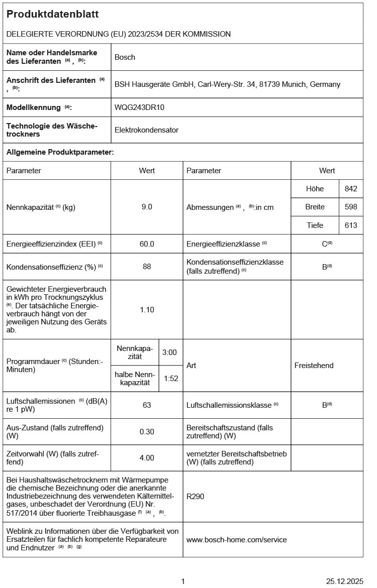 - Kondensationseffizienzklasse: B (auf einer Skala von A bis D)