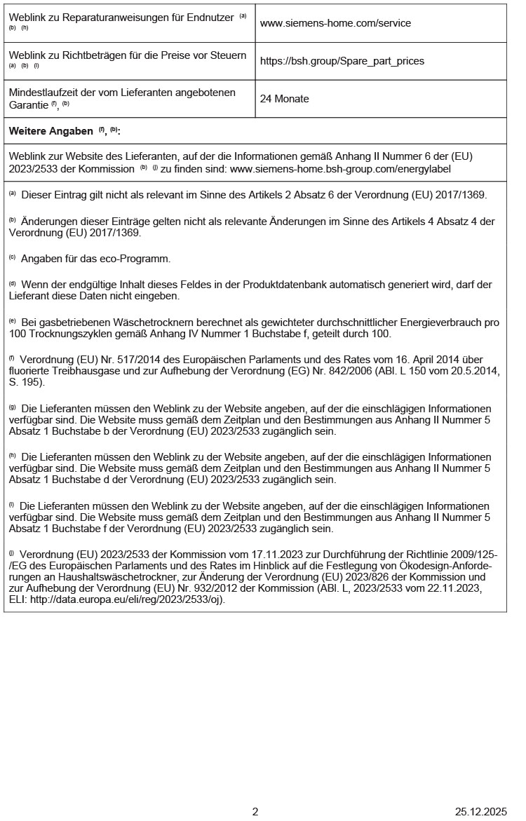 ² Gewichteter durchschnittlicher Energieverbrauch für 100 Trocknungszyklen in kWh im Eco Programm