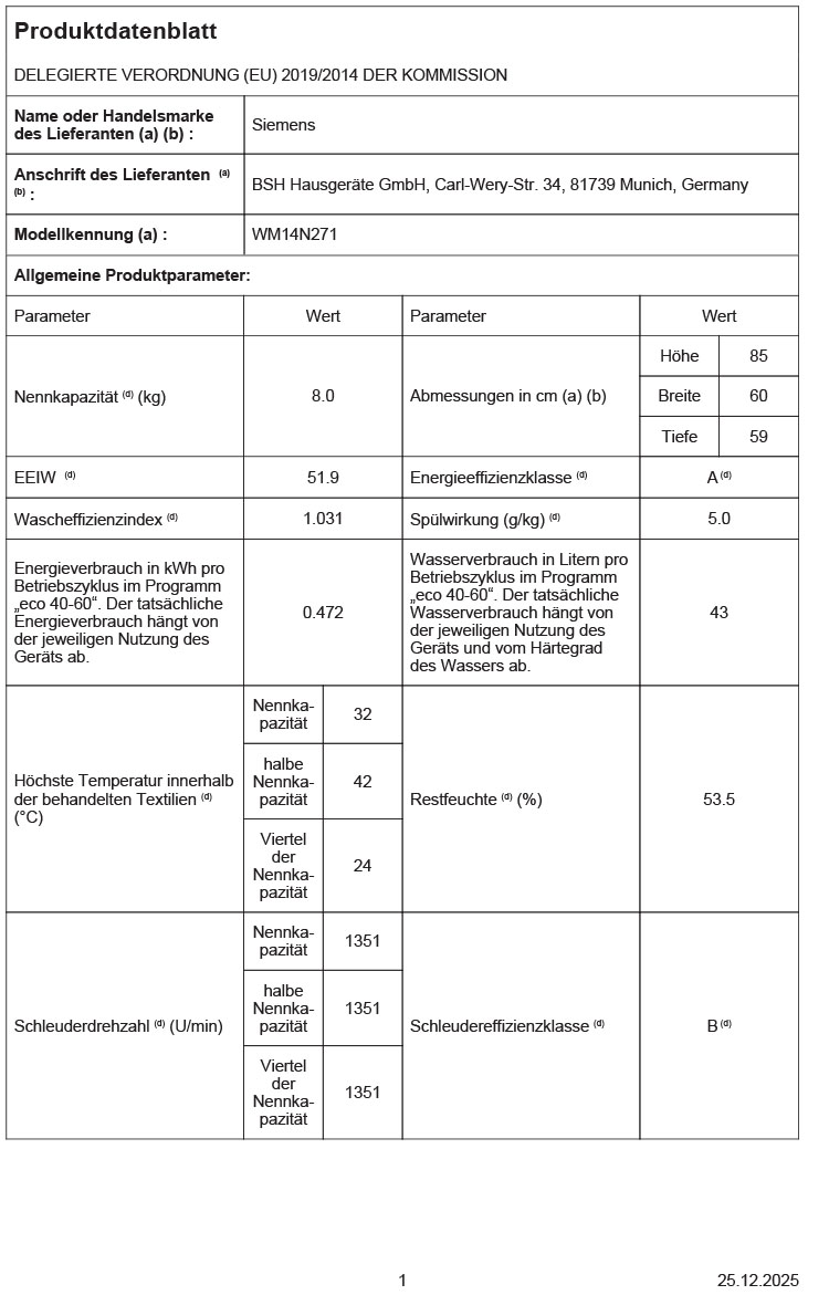 - Stromverbrauch² / Wasserverbrauch³: 47 kWh / 43 Liter