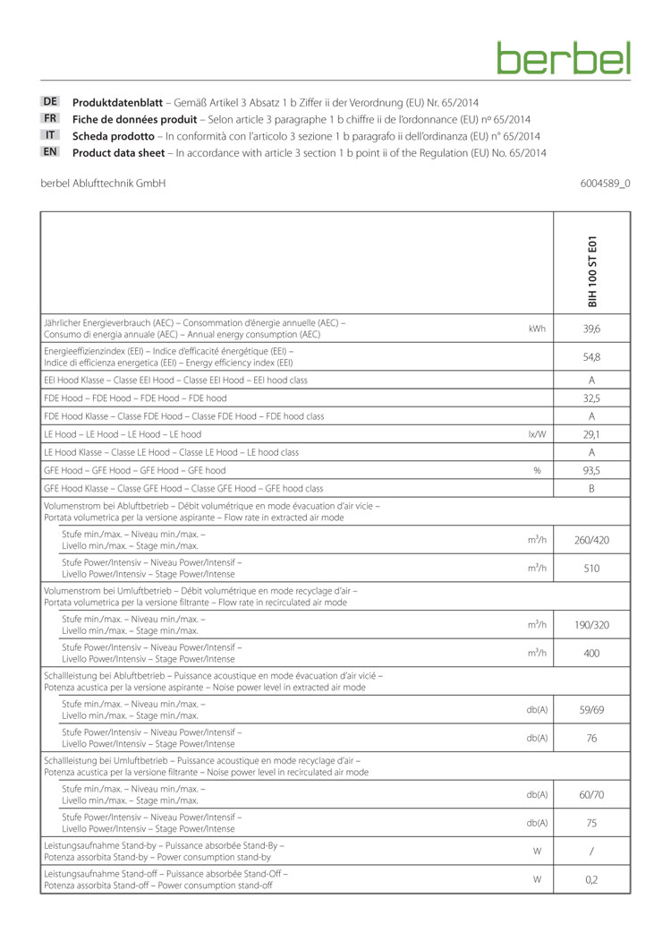 - Stromanschluss: berbel Inselhauben sind mit einem Wieland-Stecker ausgestattet. (Für Anschluss an Netzkabel)