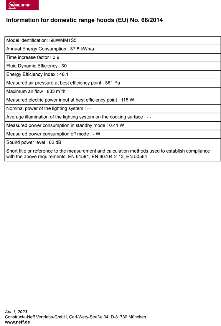 - Geräuschwerte nach EN 60704-2-13 bei Abluftbetrieb: Max. Normalstufe: 62 dB(A) re 1 pW, Intensivstufe: 71 dB(A) re 1 pW
