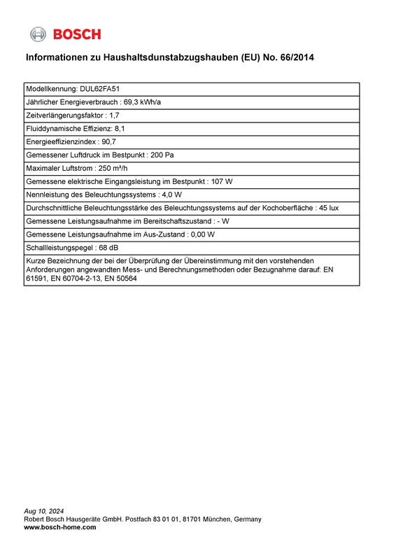 Geräuschwerte nach EN 60704-3 und EN 60704-2-13 max. Normalstufe Abluftbetrieb: 68 dB(A) re 1 pW (54 dB(A) re 20 µPa Schalldruck