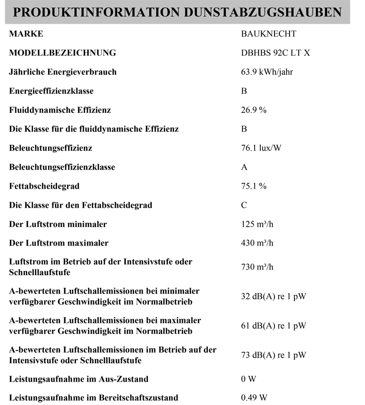 - Gebläseleistung im Abluftbetrieb: max. Normalstufe 448 m³/h, Intensivstufe 735 m³/h