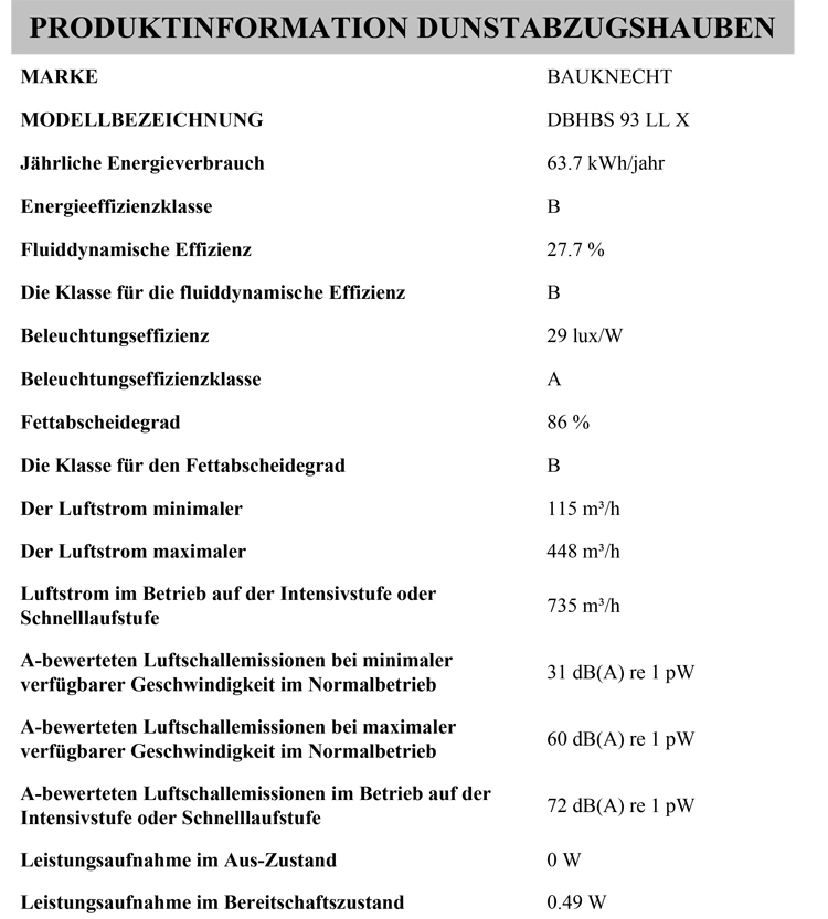 - Gebläseleistung im Abluftbetrieb: max. Normalstufe 448 m³/h, Intensivstufe 735 m³/h