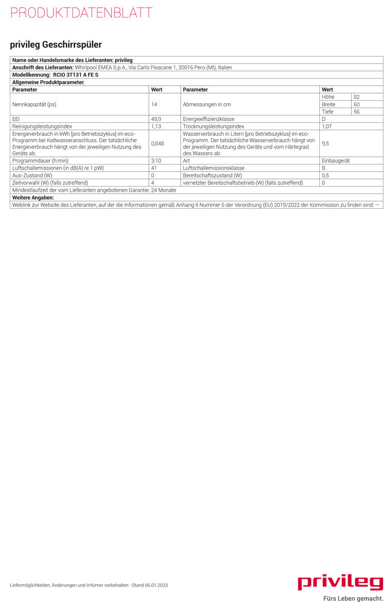 - Energieeffizienzklasse D, Reinigungsleistungsindex 1,13, Trocknungsleistungsindex 1,07