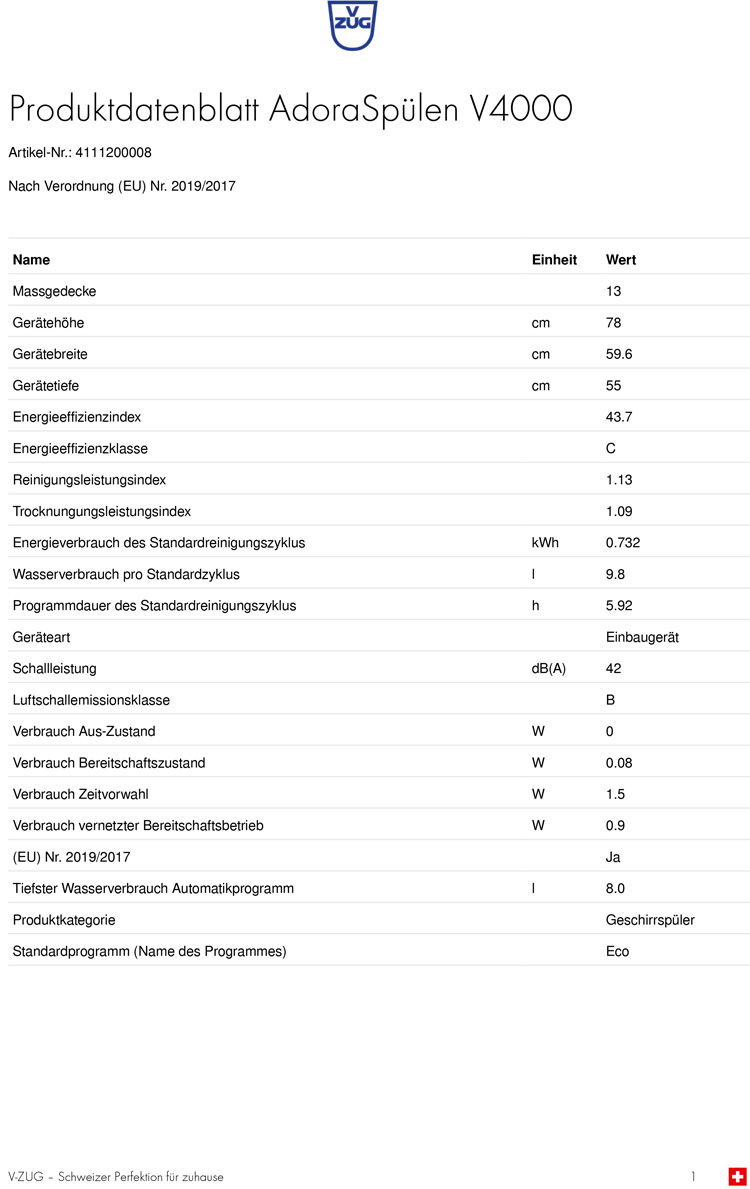 - Reparatur des Artikels V-ZUG Adora V4000 AS4T41112, vollintegrierbar, 4111200008