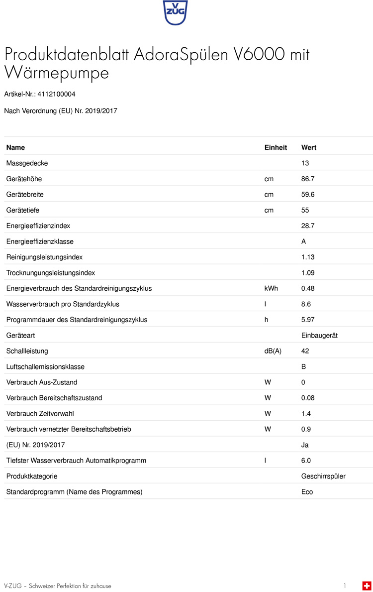 - Austausch gegen einen gleichwertigen oder neuen Artikel V-ZUG Adora V6000 AS6T41121, WLAN, EEK: A, 4112100004 (ggf. auch ein Nachfolgemodell)